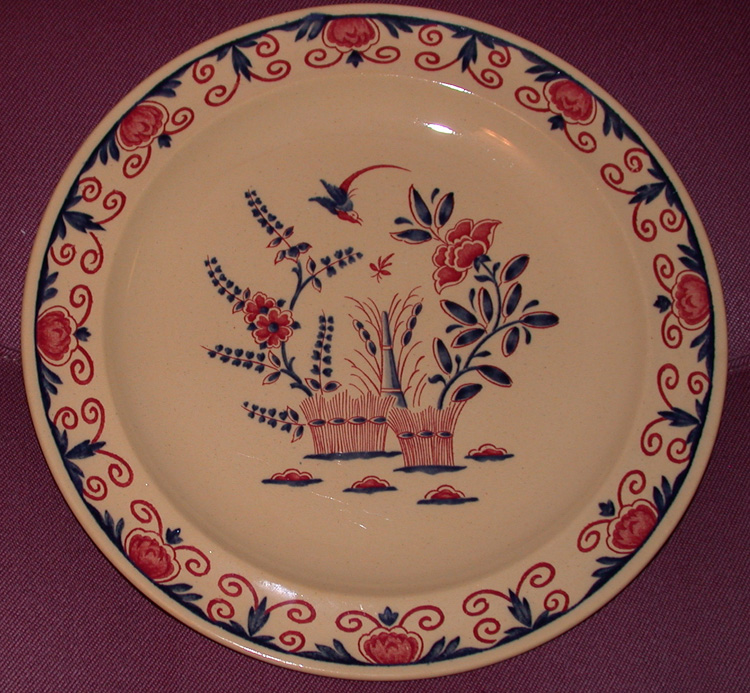 RED + BLUE ON TAN/BEIGE, 10" DIA CONCAVE SHAPE